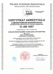Dodano: 11 marca 2026Dział Laboratorium Zakładu Wodociągów i Kanalizacji w Gostyniu w dniu 10.02.2026 r. uzyskał Certyfikat Polskiego Centrum Akredytacji Nr AB 1957. Certyfikat PCA jest potwierdzeniem spełnienia wymagań normy PN-EN ISO/IEC 17025:2018-02 i stanowi gwarancję wiarygodności, bezstronności i poufności wykonywanych badań.