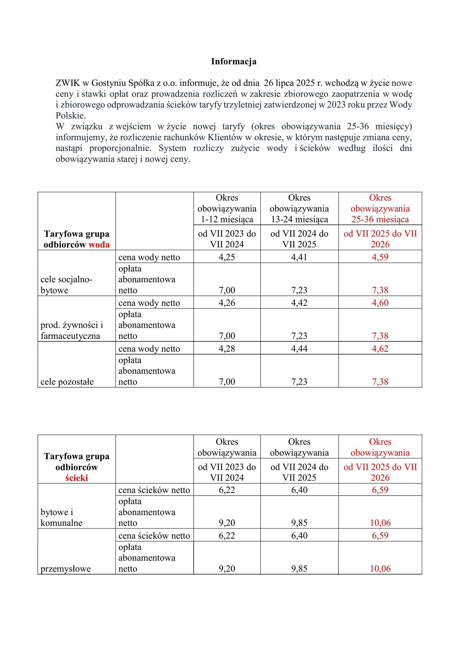 Informacja - nowe ceny i stawki opłat oraz prowadzenia rozliczeń