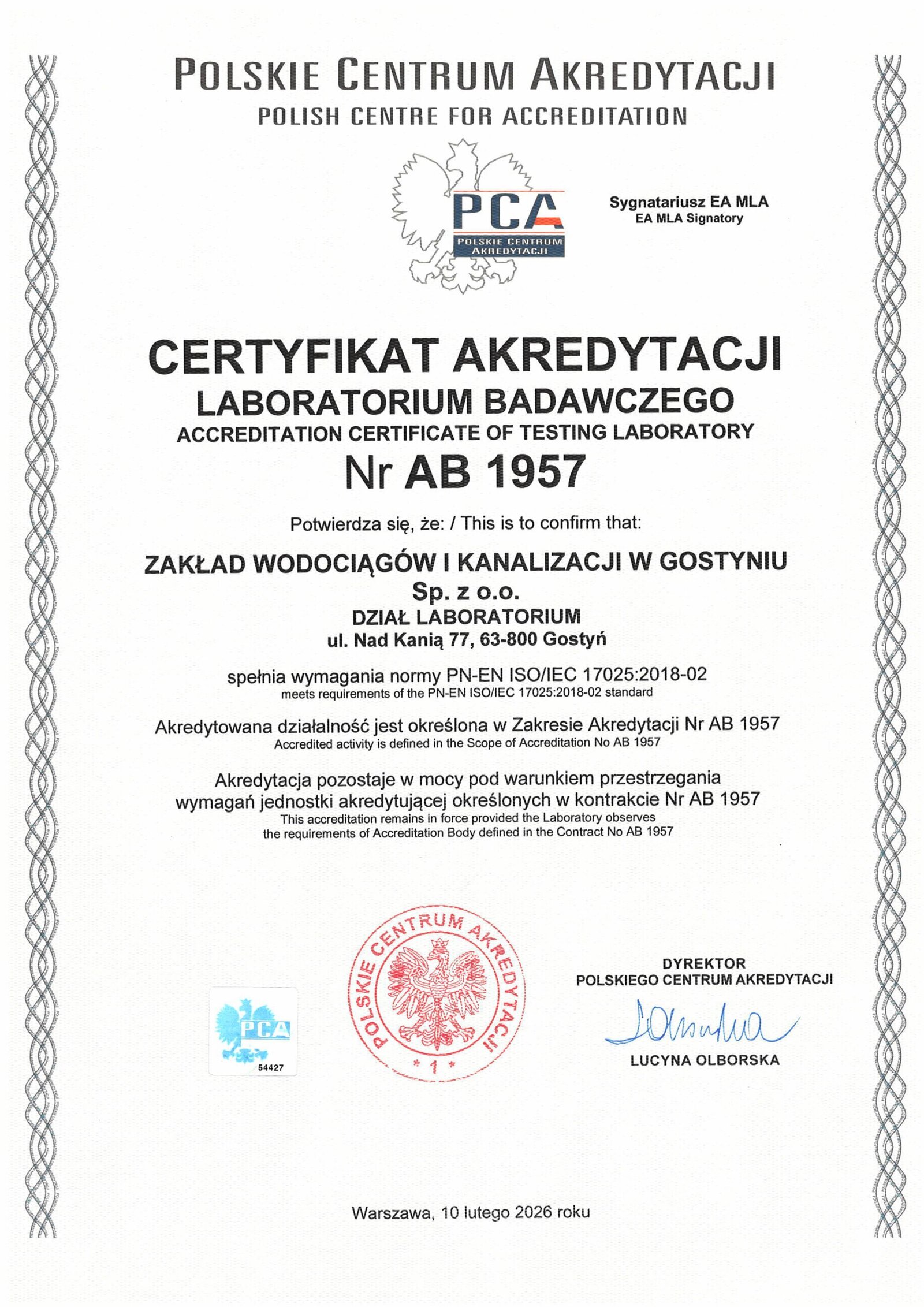 Dodano: 11 marca 2026Dział Laboratorium Zakładu Wodociągów i Kanalizacji w Gostyniu w dniu 10.02.2026 r. uzyskał Certyfikat Polskiego Centrum Akredytacji Nr AB 1957. Certyfikat PCA jest potwierdzeniem spełnienia wymagań normy PN-EN ISO/IEC 17025:2018-02 i stanowi gwarancję wiarygodności, bezstronności i poufności wykonywanych badań.
