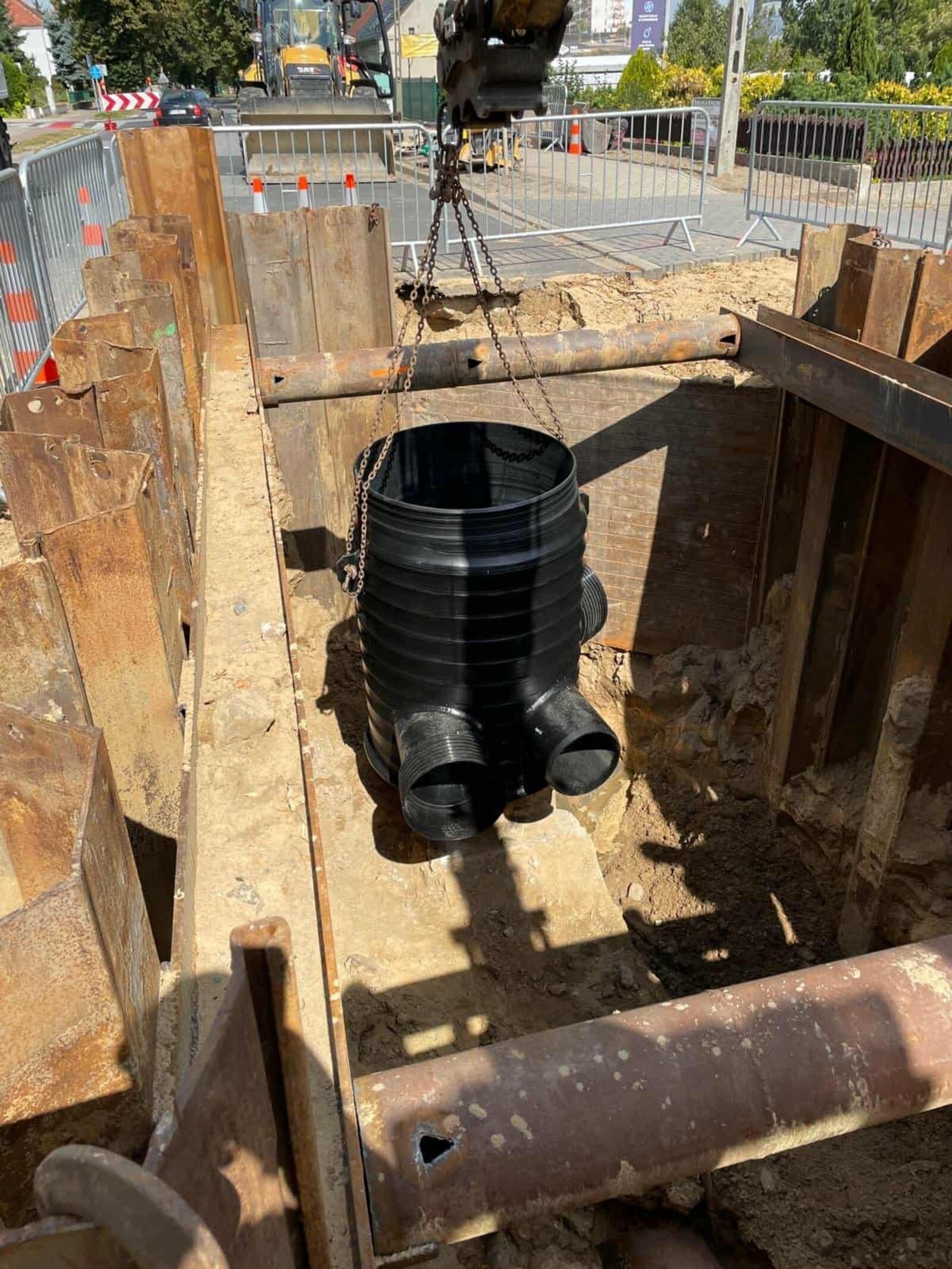 Nową, indywidualnie zaprojektowaną studnię kanalizacyjną wykonała i dostarczyła firma Kaczmarek Malewo spółka komandytowa. W jej miejscu zdemontowano starą studnię i część rur kanalizacyjnych, a następnie zamontowano nową konstrukcję, łącząc ją z dwoma rurociągami o średnicy 500 mm.