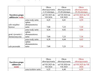 ZWIK w Gostyniu Spółka z o.o. informuje, że od dnia 26 lipca 2025 r. wchodzą w życie nowe ceny i stawki opłat oraz prowadzenia rozliczeń w zakresie zbiorowego zaopatrzenia w wodę i zbiorowego odprowadzania ścieków taryfy trzyletniej zatwierdzonej w 2023 roku przez Wody Polskie.